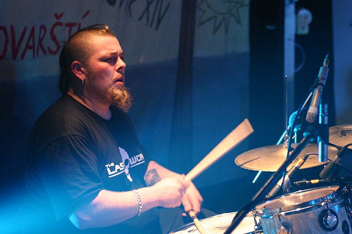 No, voni měli příšernýho bubeníka a vlastně skoro neuměli hrát a taky se tam furt střídali lidi. Pak tam bubnoval bratranec našeho bubeníka, kterej asi po půl roce odlít na stálo do Kanady a zůstali tu po něm bicí. Já jsem v tý době už nikde nehrál, tak jsem přesedlal na bicí a už jsem tam zůstal. Je to moje nejlepší kapela, ve který jsem kdy hrál. Skvělý lidi.